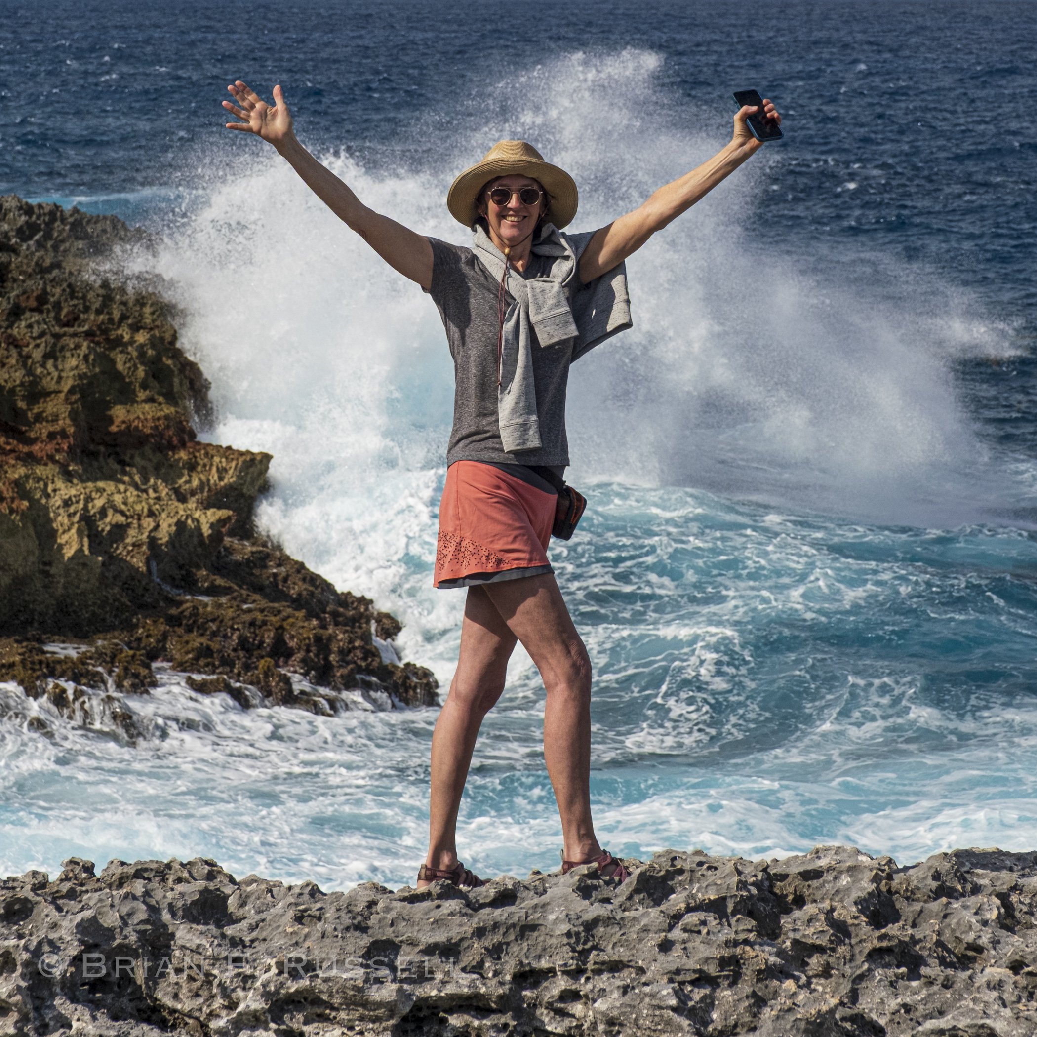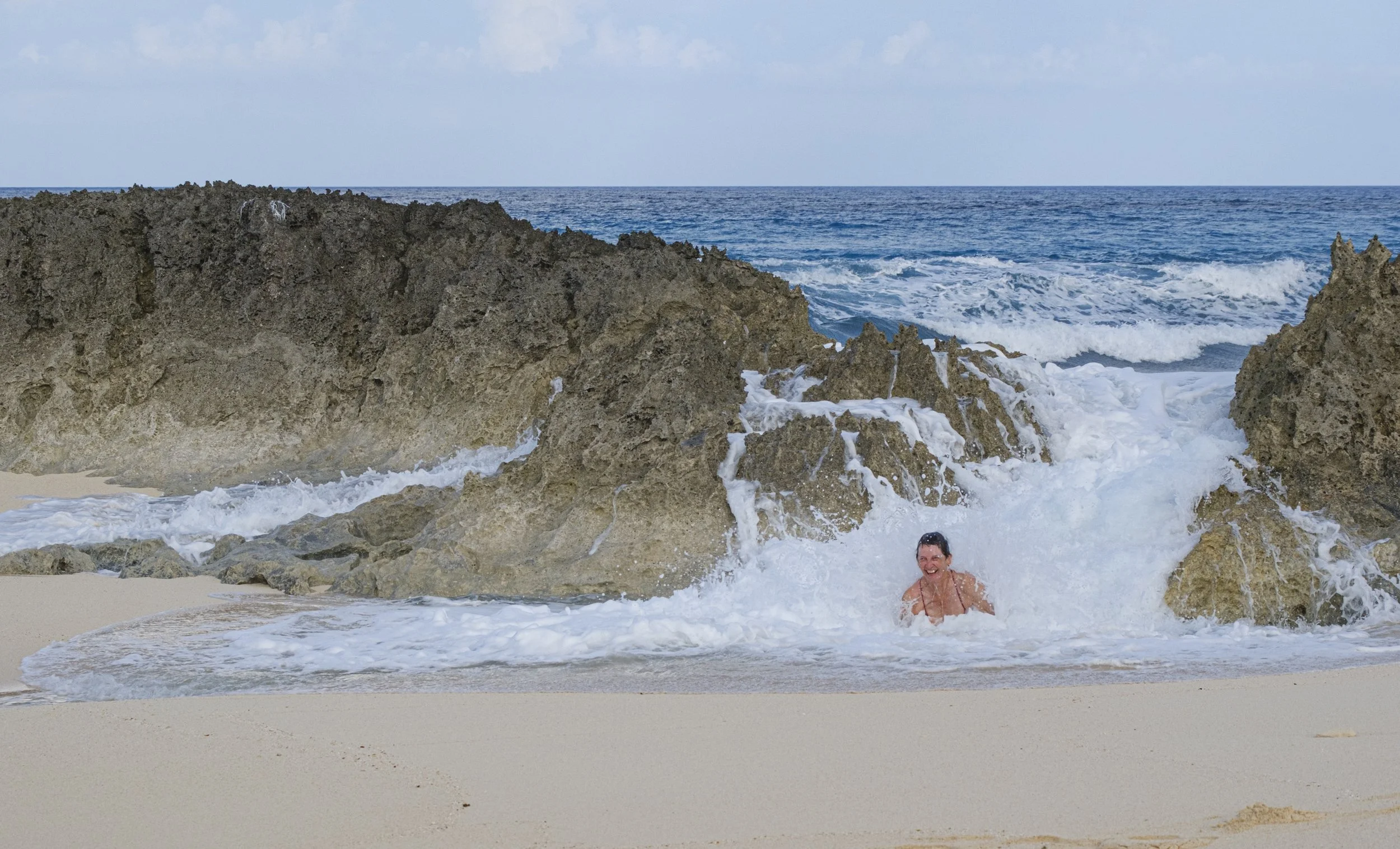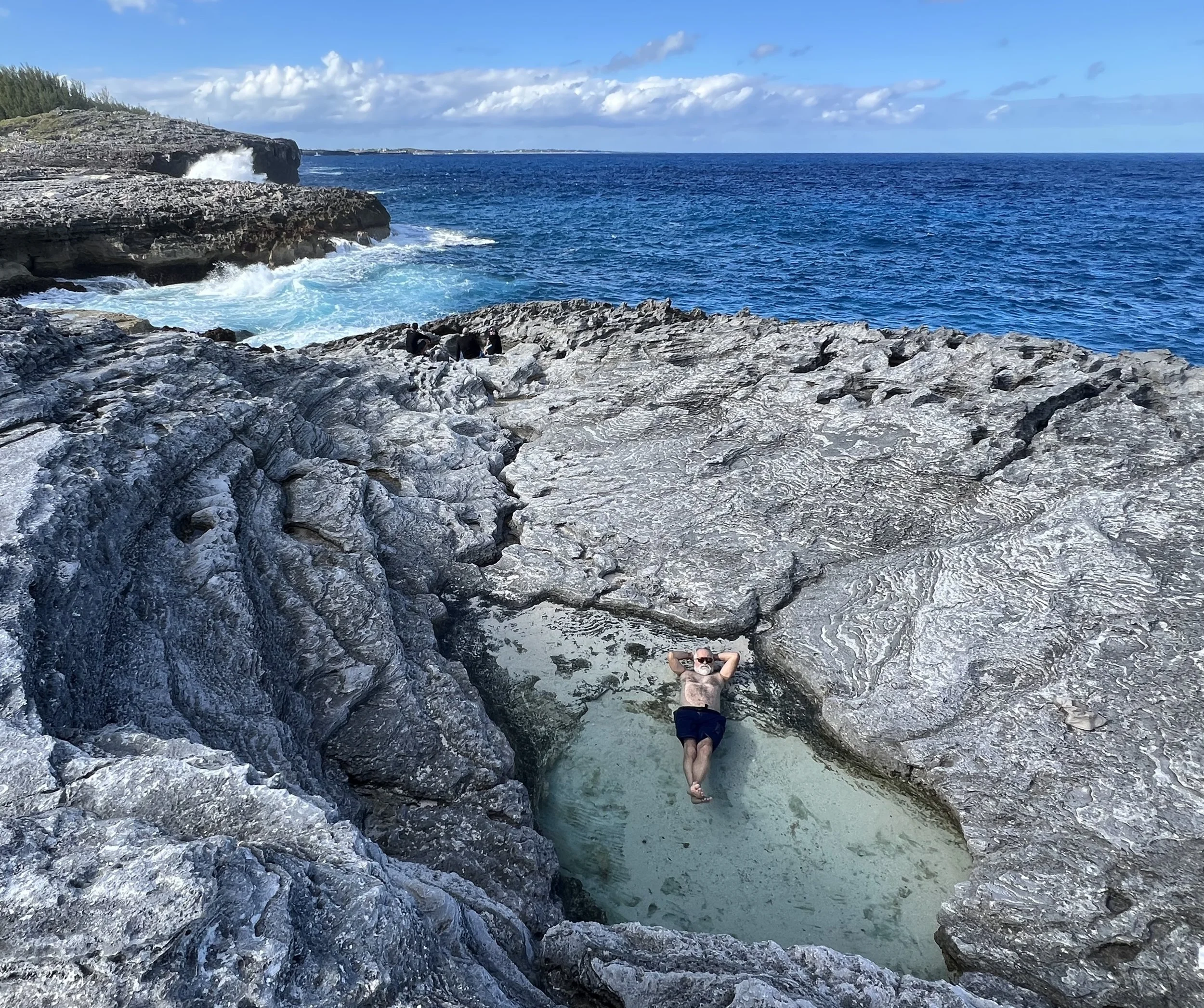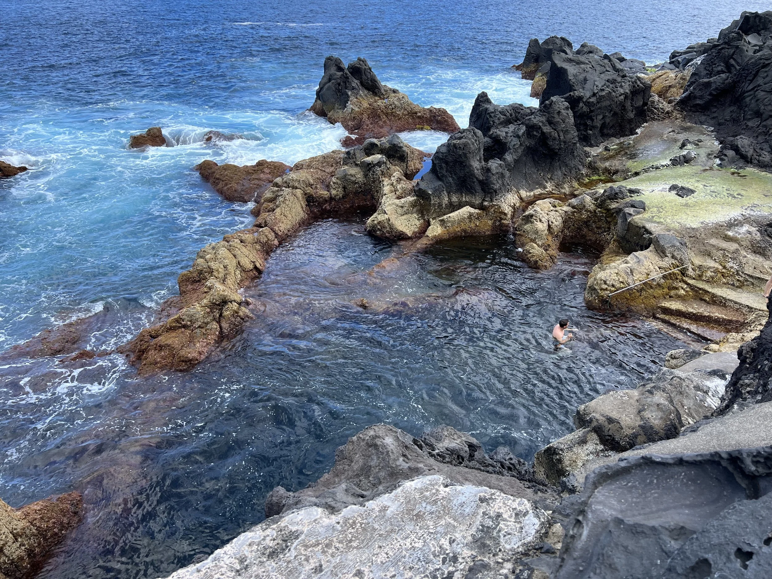 We anchored off a lovely beach and took the dinghy in to explore. The Queens Baths are a series of large rock pools on the Atlantic side of the island that must be lovely on a calm sunny day. When we visited, the waves were crashing and swirling onto the shore. Far too boisterous to consider getting too close, you could so easily get washed away or dashed onto the razor sharp rocks. We instead found a pool on the cliff top and enjoyed a dip there.