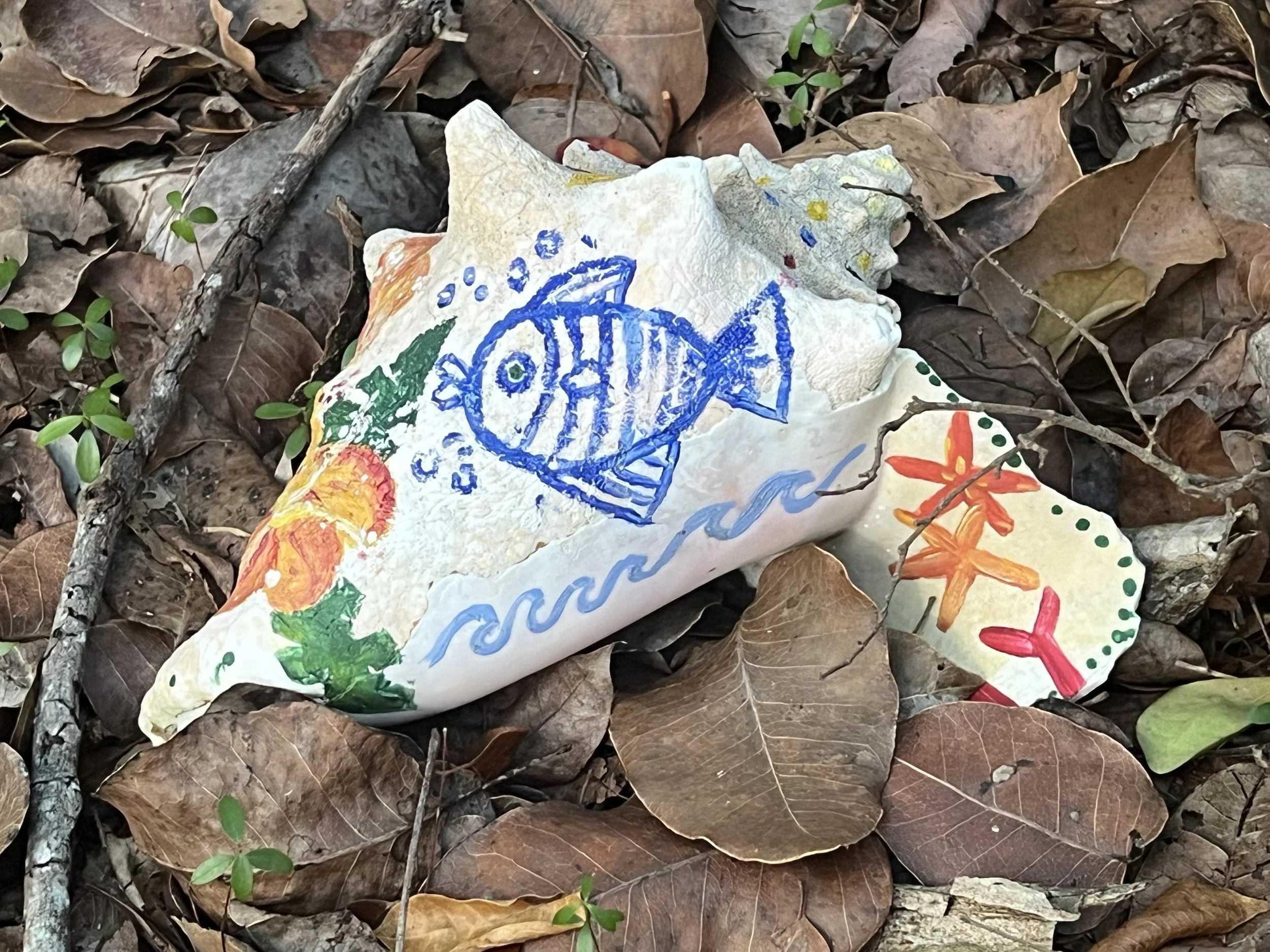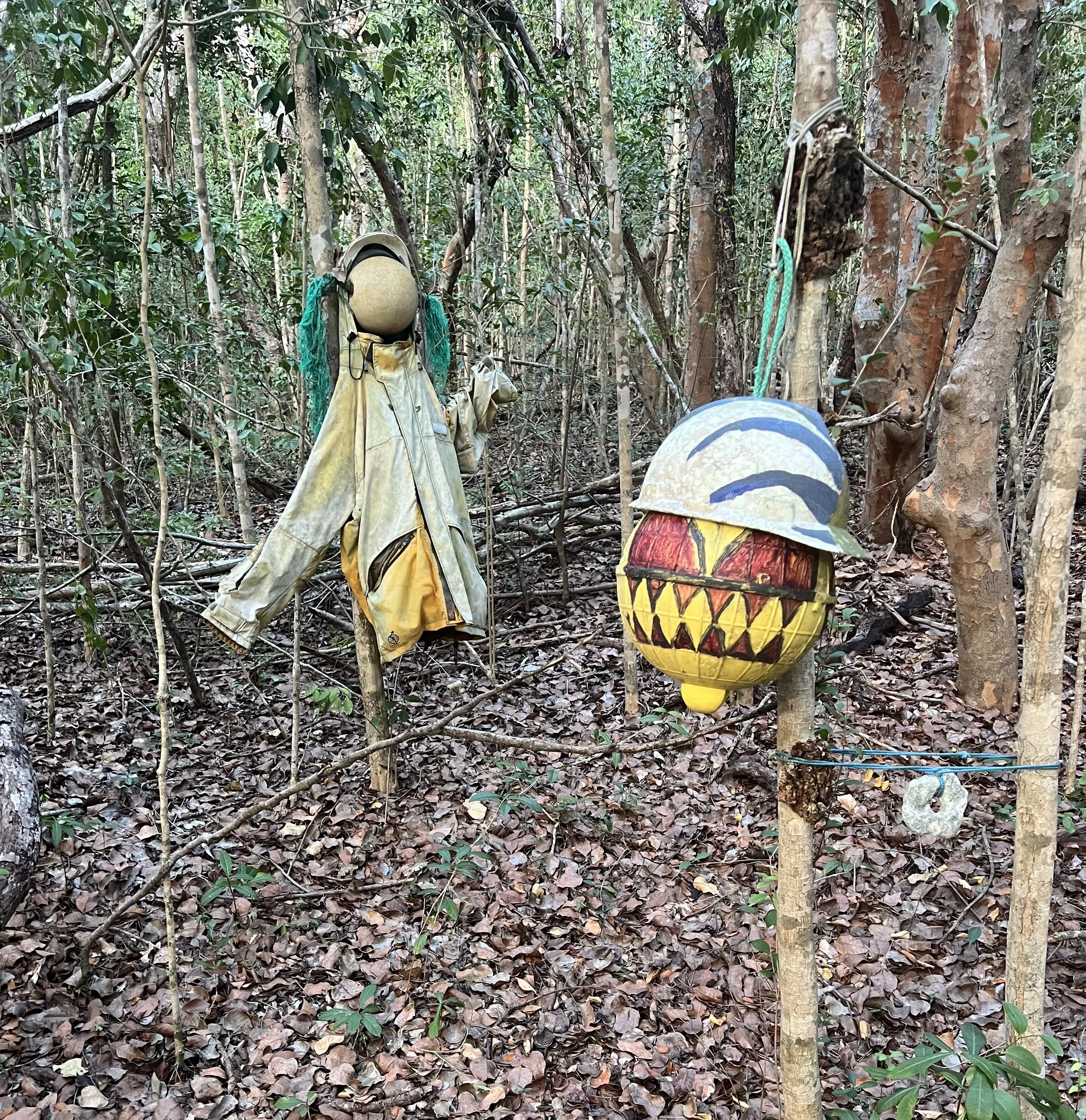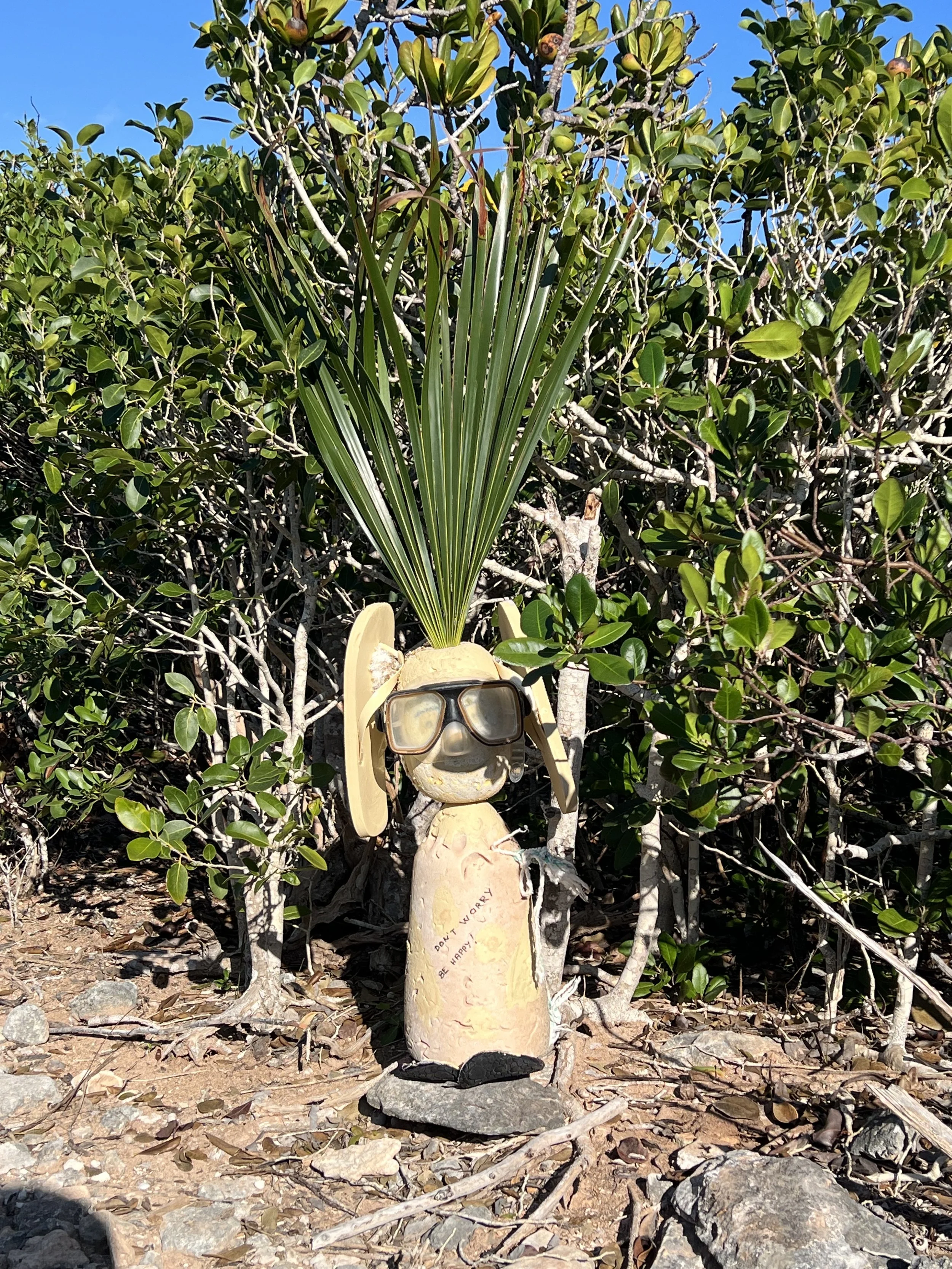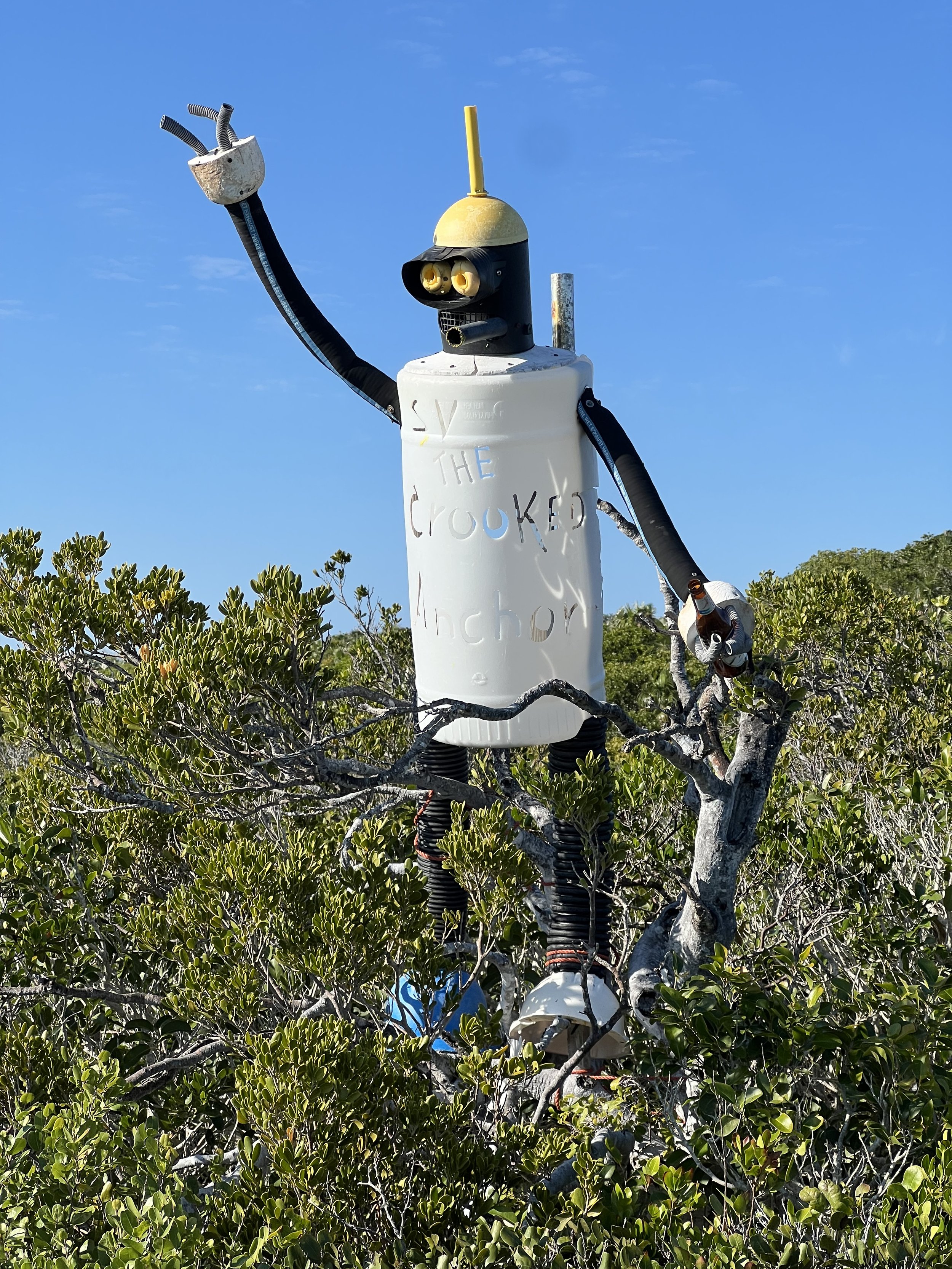 After checking in at Grand Cay, we sailed south down the Sea of Abaco. We stopped at Allans Pensacola for a couple of nights, before moving south to Manjack Cay. This spot was recommended by the crew of SV Quinn; we always welcome suggestions. The anchorage was nice and roomy, there was a lovely sandy beach to land the dinghy, and an “art walk” through the bushes and along the shore. There are many of these trails throughout the Bahamas, the trail indicated by collected beach trash; a flip flop, maybe a fishing float or some netting. This one was more curated, more effort was made on each piece. Some were quite ingenious.