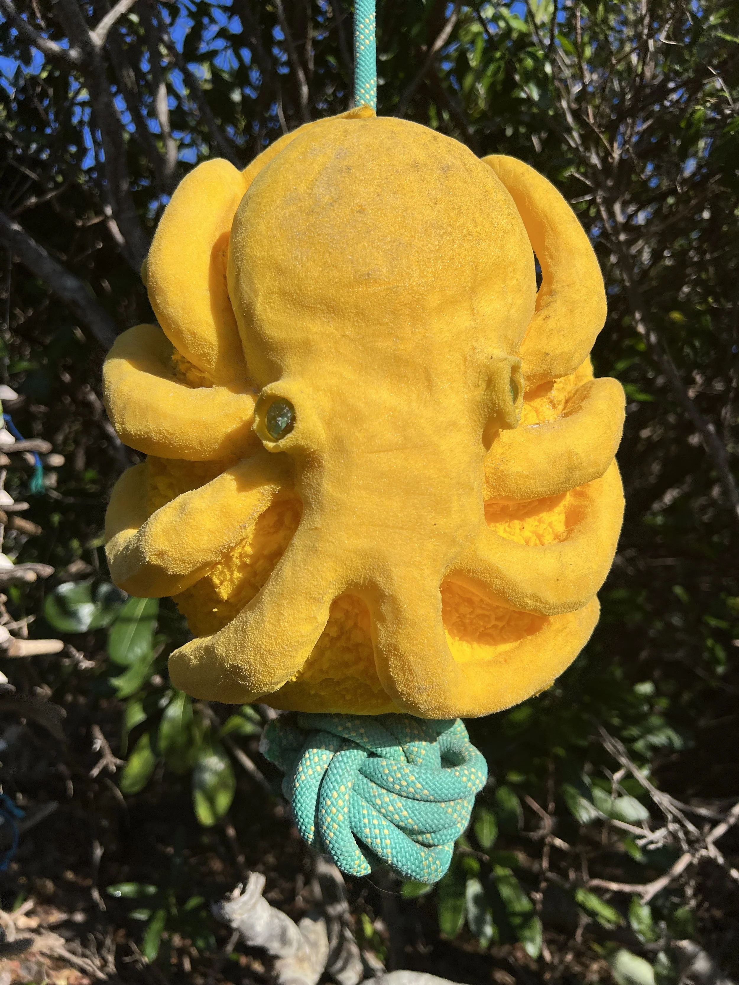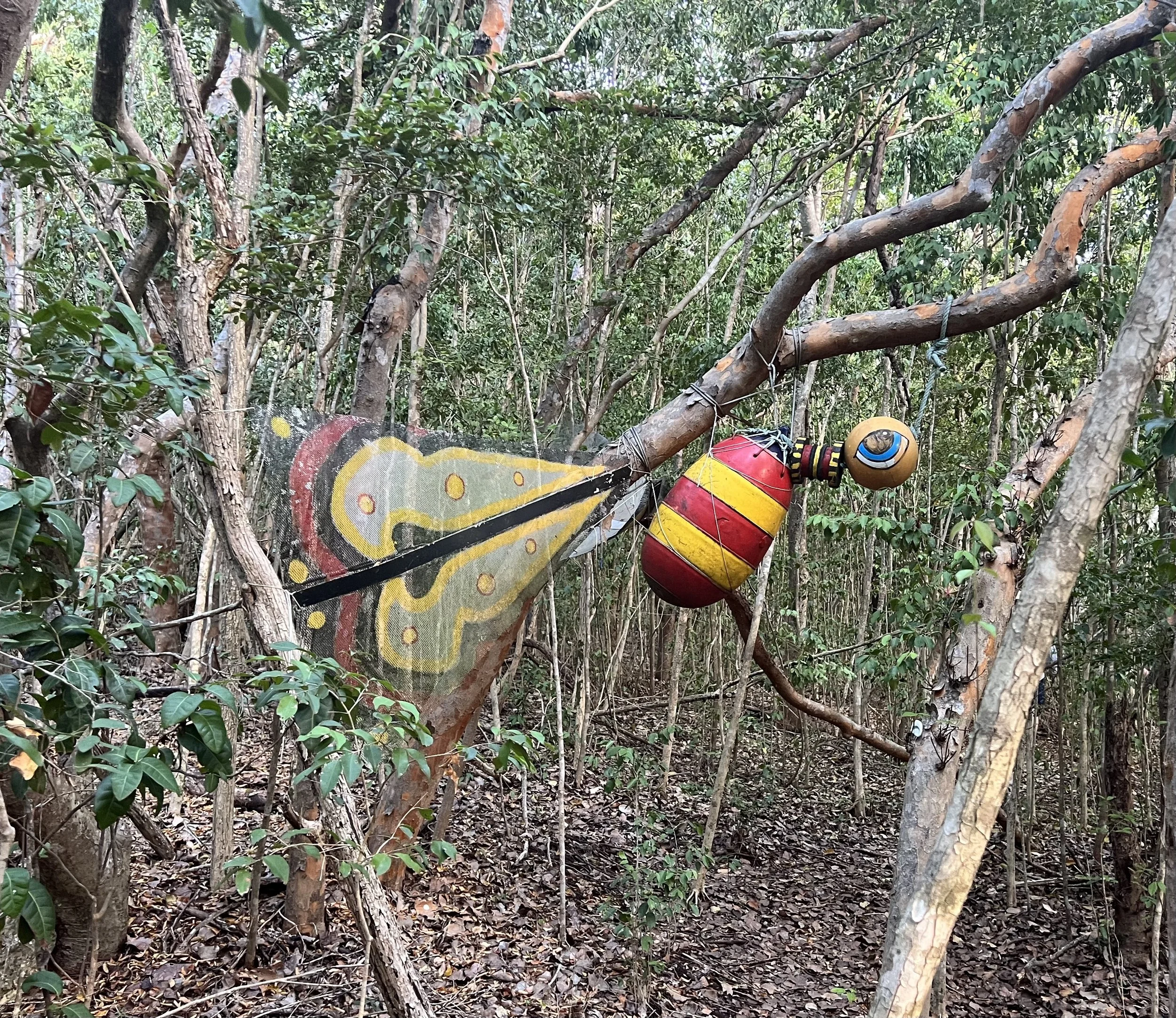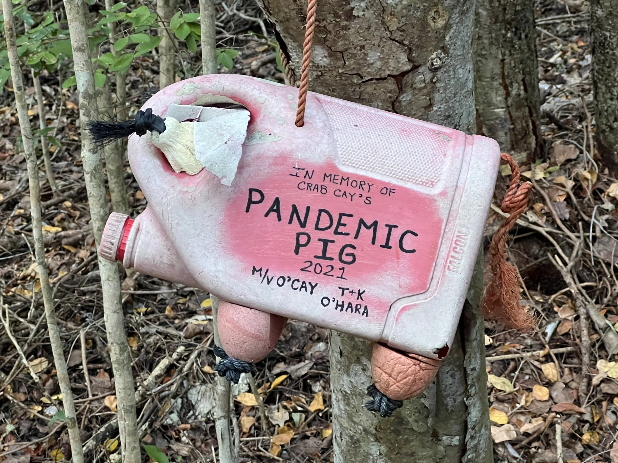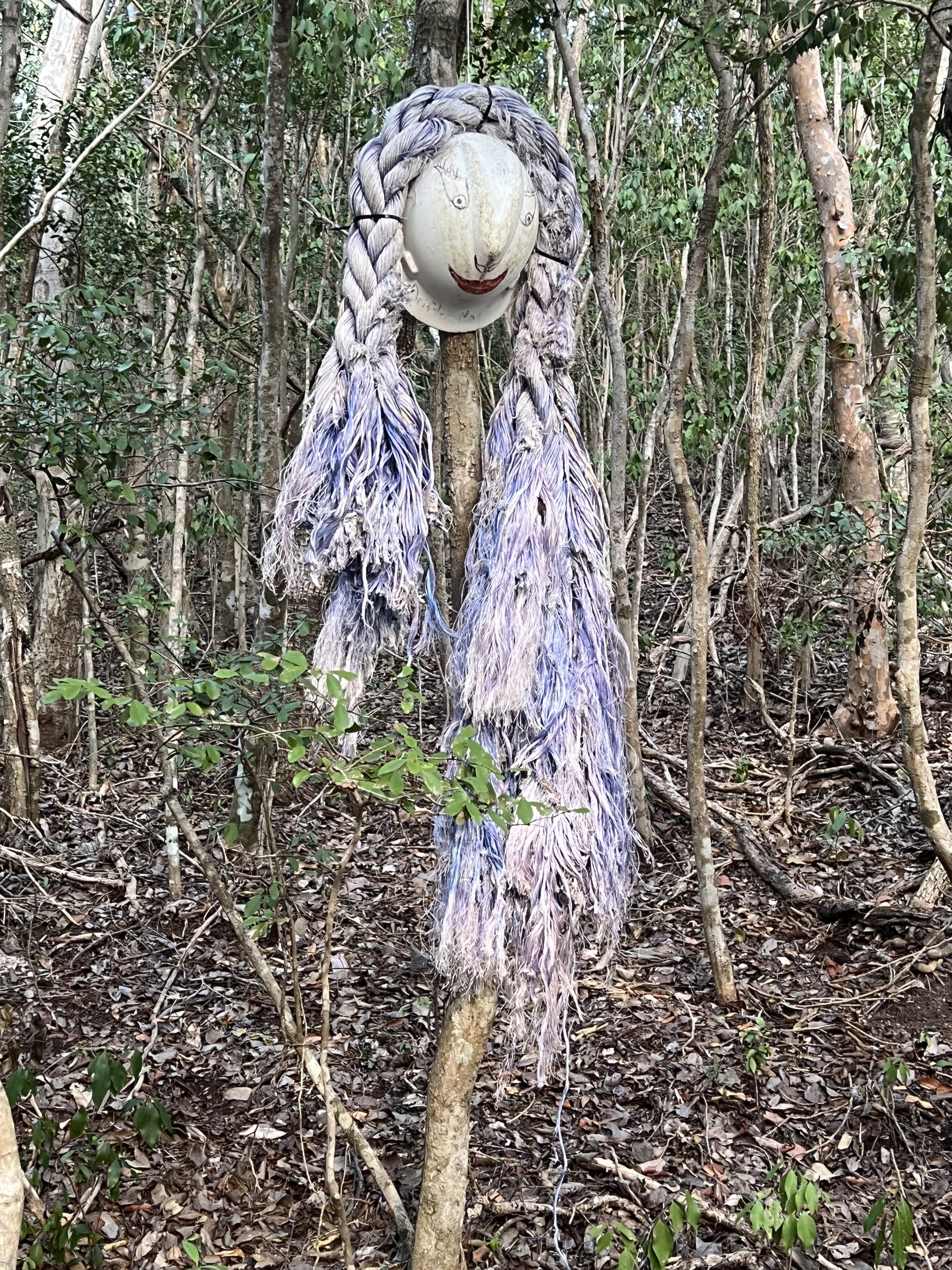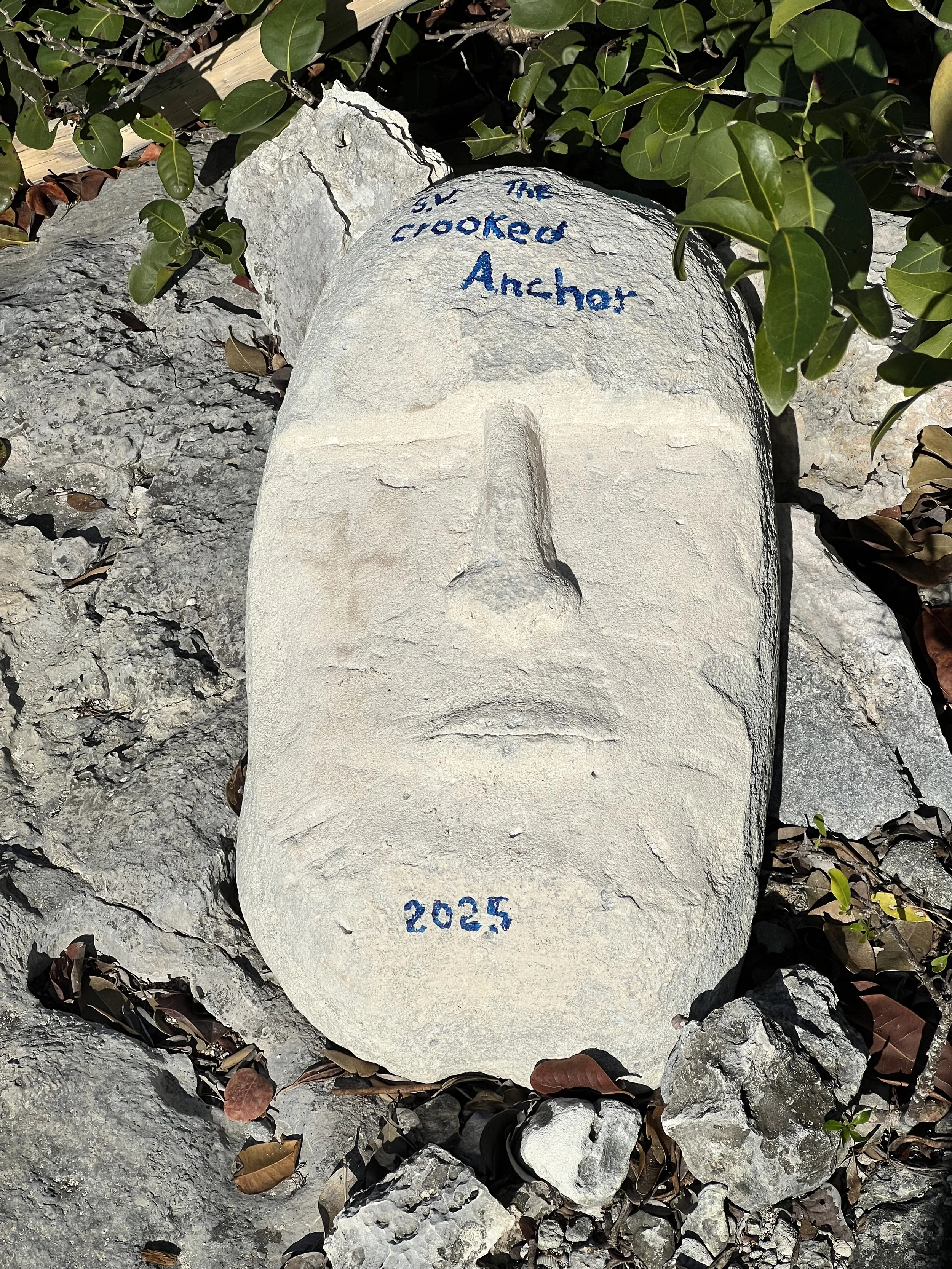 After checking in at Grand Cay, we sailed south down the Sea of Abaco. We stopped at Allans Pensacola for a couple of nights, before moving south to Manjack Cay. This spot was recommended by the crew of SV Quinn; we always welcome suggestions. The anchorage was nice and roomy, there was a lovely sandy beach to land the dinghy, and an “art walk” through the bushes and along the shore. There are many of these trails throughout the Bahamas, the trail indicated by collected beach trash; a flip flop, maybe a fishing float or some netting. This one was more curated, more effort was made on each piece. Some were quite ingenious.