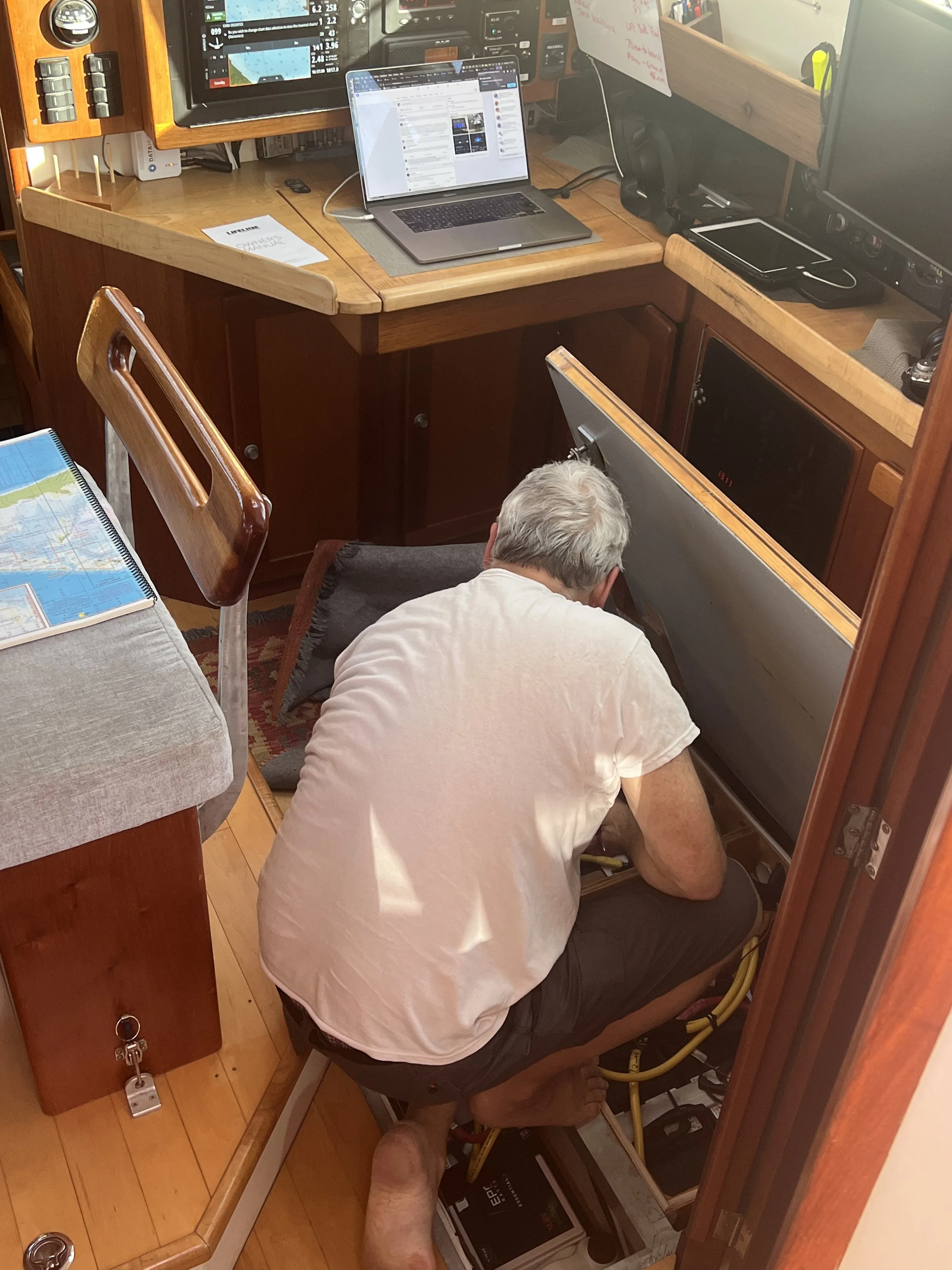 It was interesting to wander around the base, with a tiny helipad and dog kennel. Before you ask, no, we did not cross that suspension bridge, not after seeing that collapsed stairway. The flowers were blooming in the bright sun, and due to the windless weather, the mosquitoes came out in earnest. We retreated to the boat and took care of some boat chores, like replacing the wind sensor at the top of the mast.