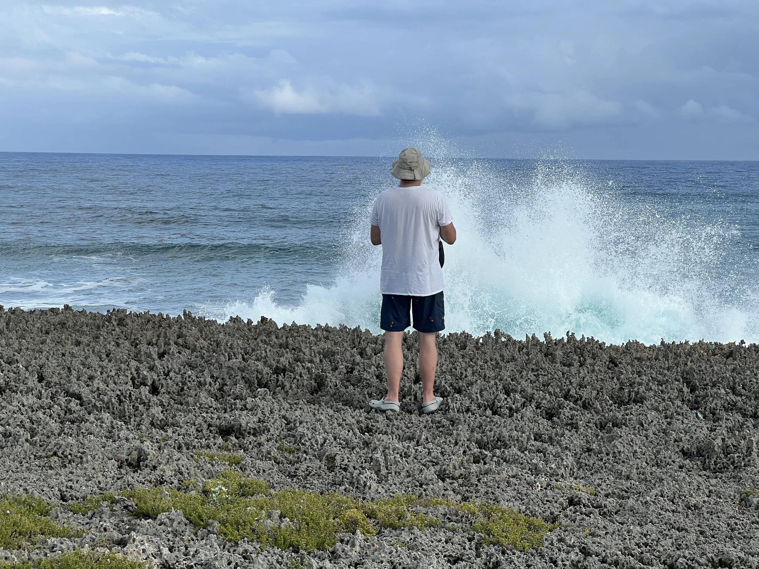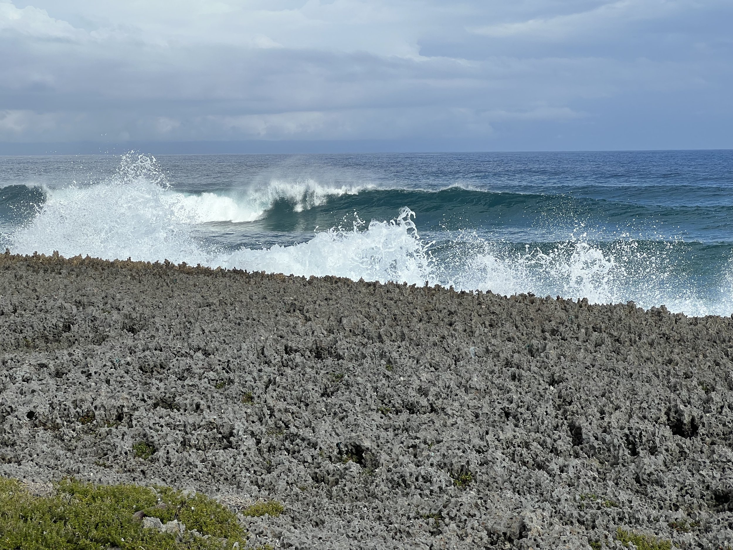 We moved south around the infamous Whale Cut, leaving the protected but shallow waters of the Sea of Abaco for a brief jaunt in the swell of the Atlantic, and anchored off Great Guana Cay. There was a small unfinished harbor cut into the rocky shoreline, with a few pilings we could tie the dinghy to. It gave us an opportunity to have a walk onshore and stretch our legs before the next big low was due to arrive, and we would be trapped onboard for a few days.