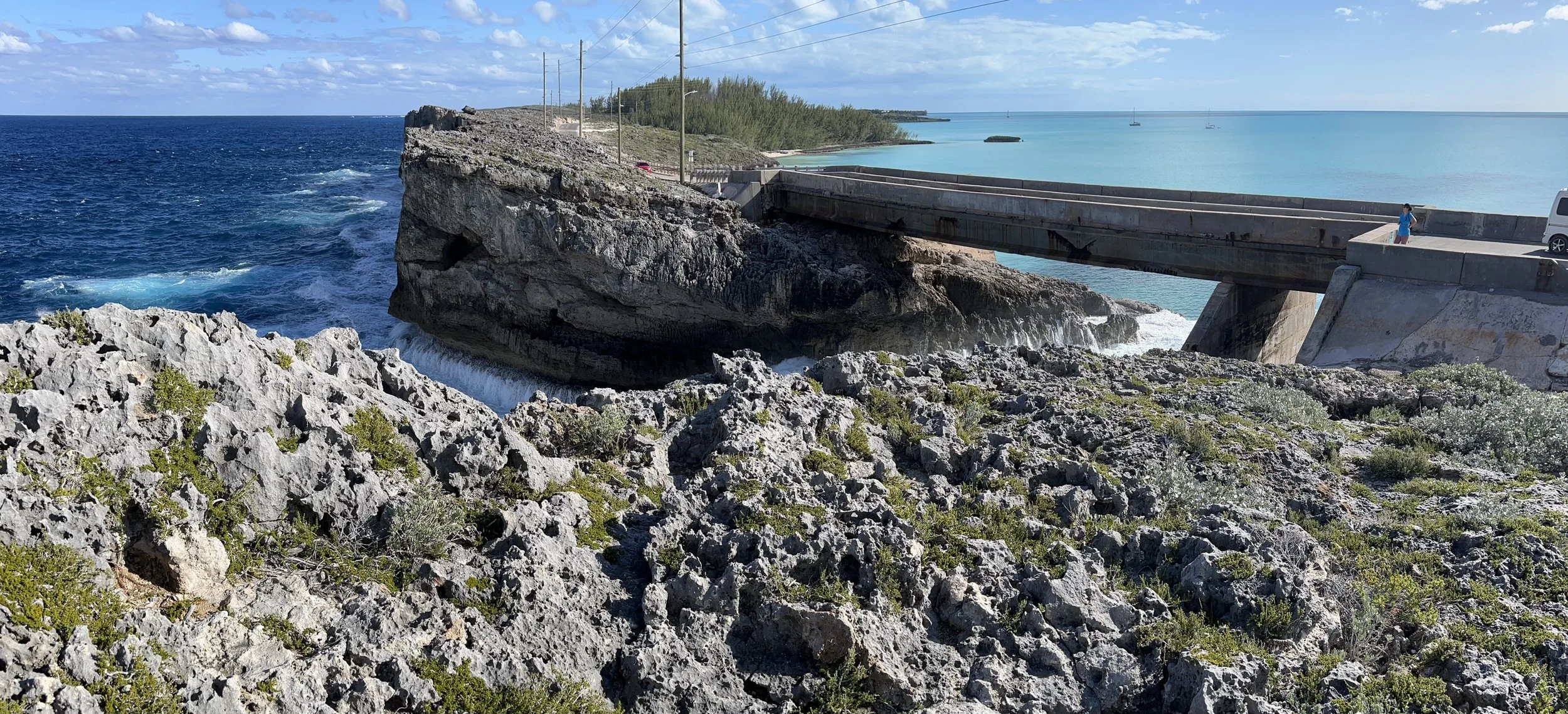 We walked down the road to check out the Glass Window, the bridge that spans the breach between north and south Eleuthera, the waves wash under from the deep blue of the Atlantic into the turquoise calm of the Bahamas bank.