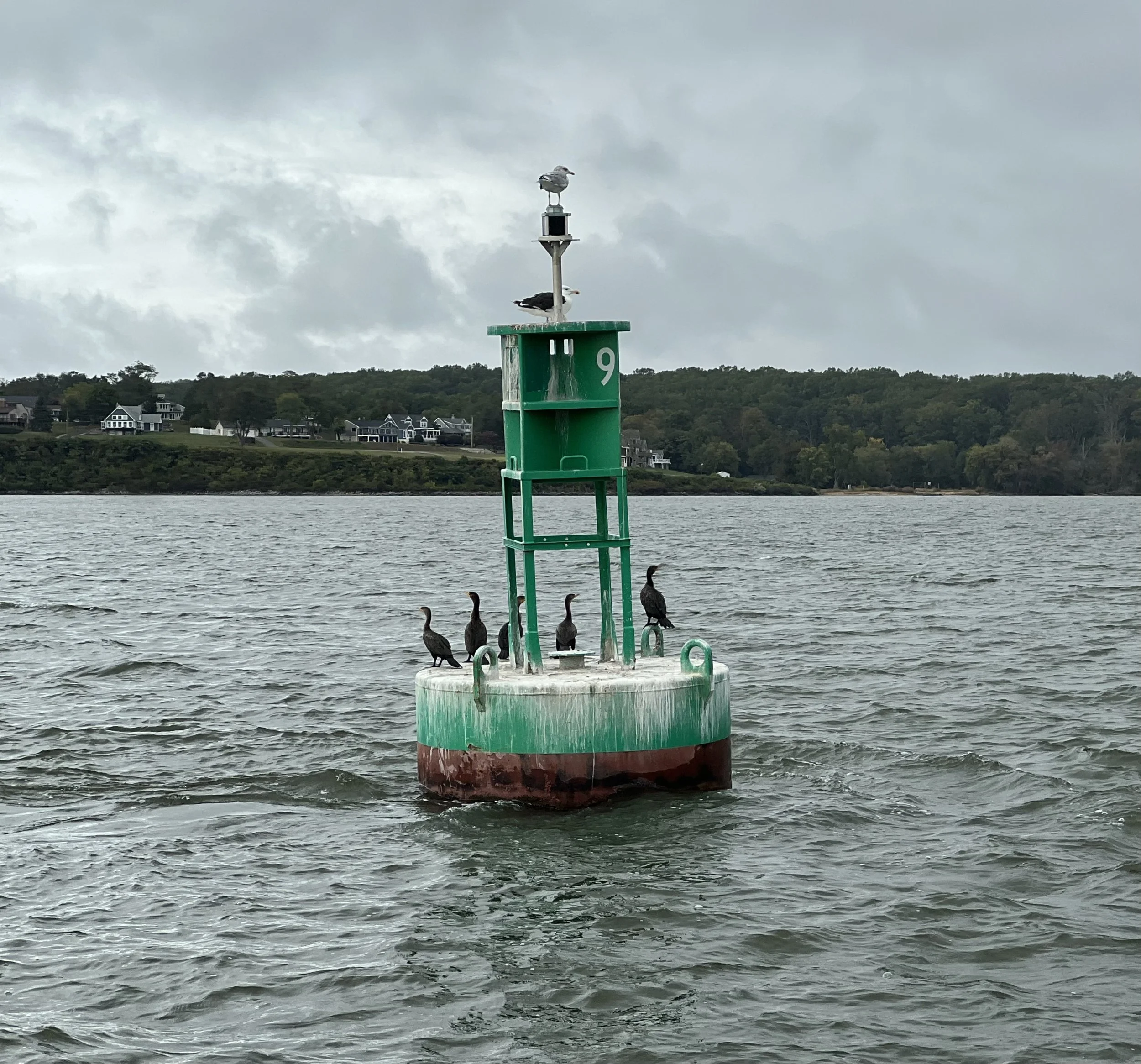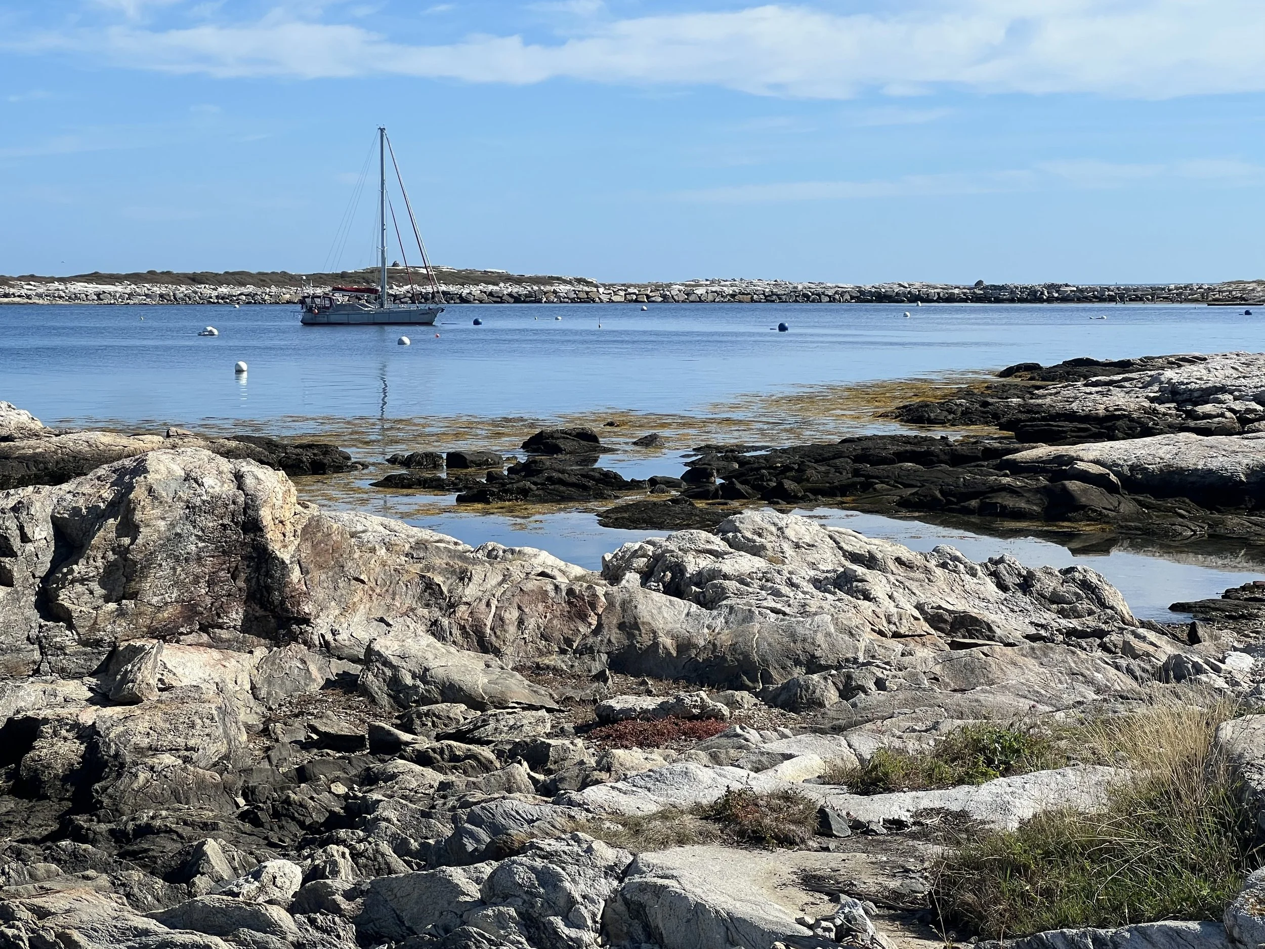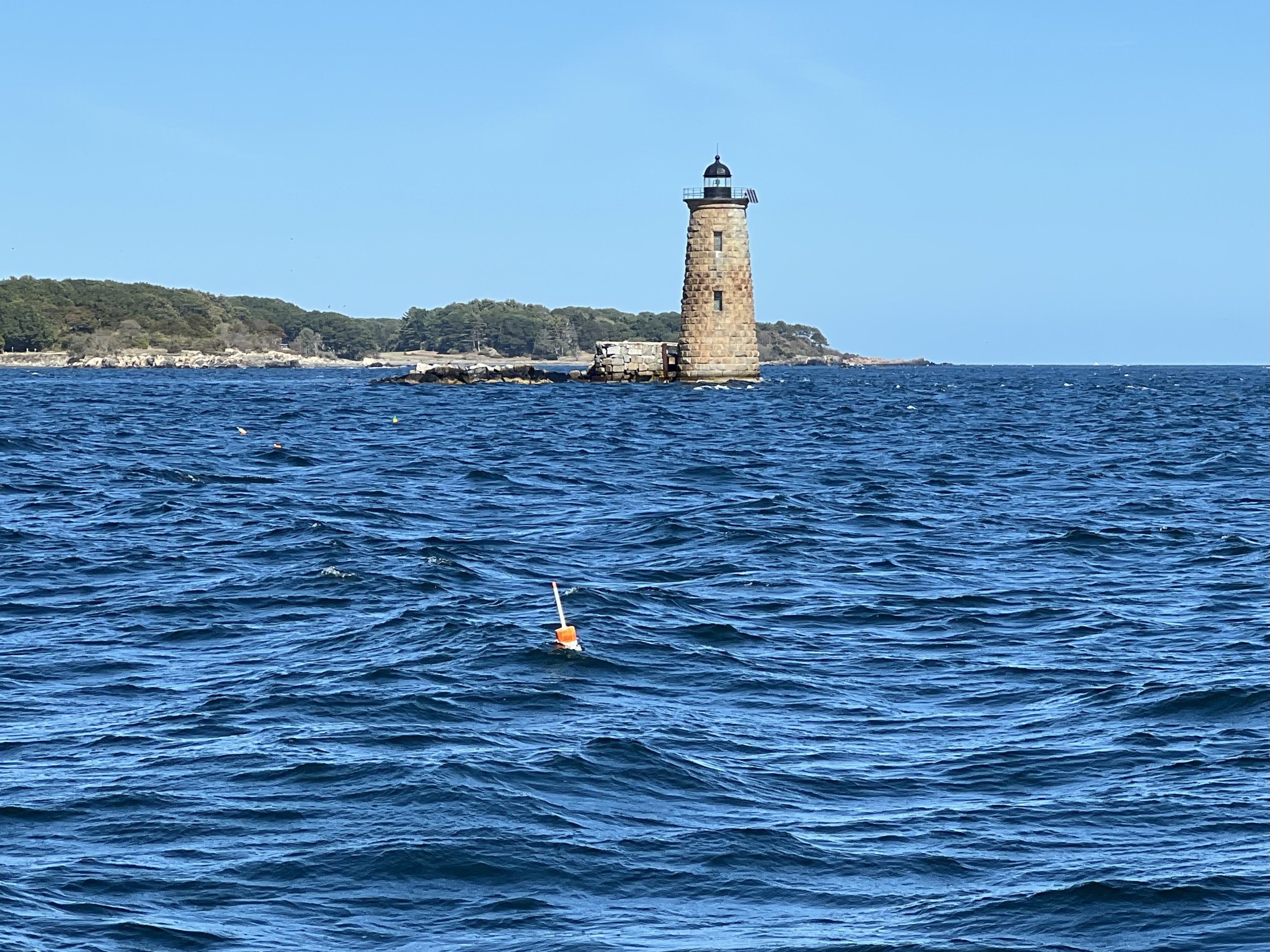 Unfortunately, it was closed for the season. We still managed to explore, checking out the huge boulders making up the recently finished causeway and the quaint chapel. After lunch we had a lovely gentle sail over to the mainland and picked up the mooring belonging to friends Diane and Tim in Kittery, Maine. There were crab pot floats everywhere, even in the channel. It made us glad we were not sailing for long in Maine waters.