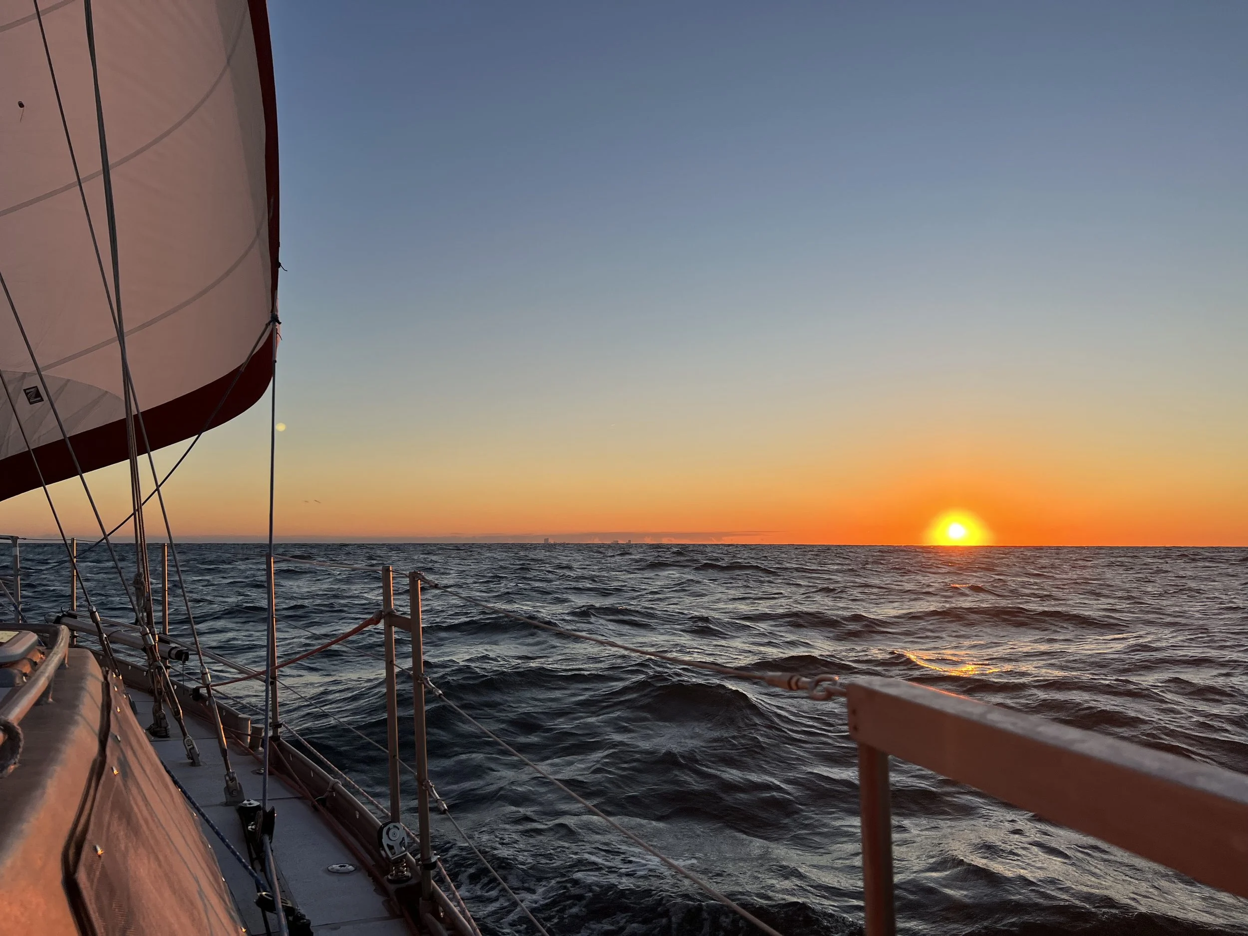 Finally the weather looks good to make the crossing from New England down to the Delaware Bay. The dinghy is tied on the foredeck and we wait until the wind shifts to the NE. The trip out of the Block Island narrow channel was quite hairy, with strong winds on the beam and large breaking waves. Still we muscled through, turned and pulled the sails out then flew south. We were literally holding on for some of the trip, picking up small visitors for a while; a couple of birds had been swept off shore in the high winds and were exhausted. They rested for an hour or so, then flew away.