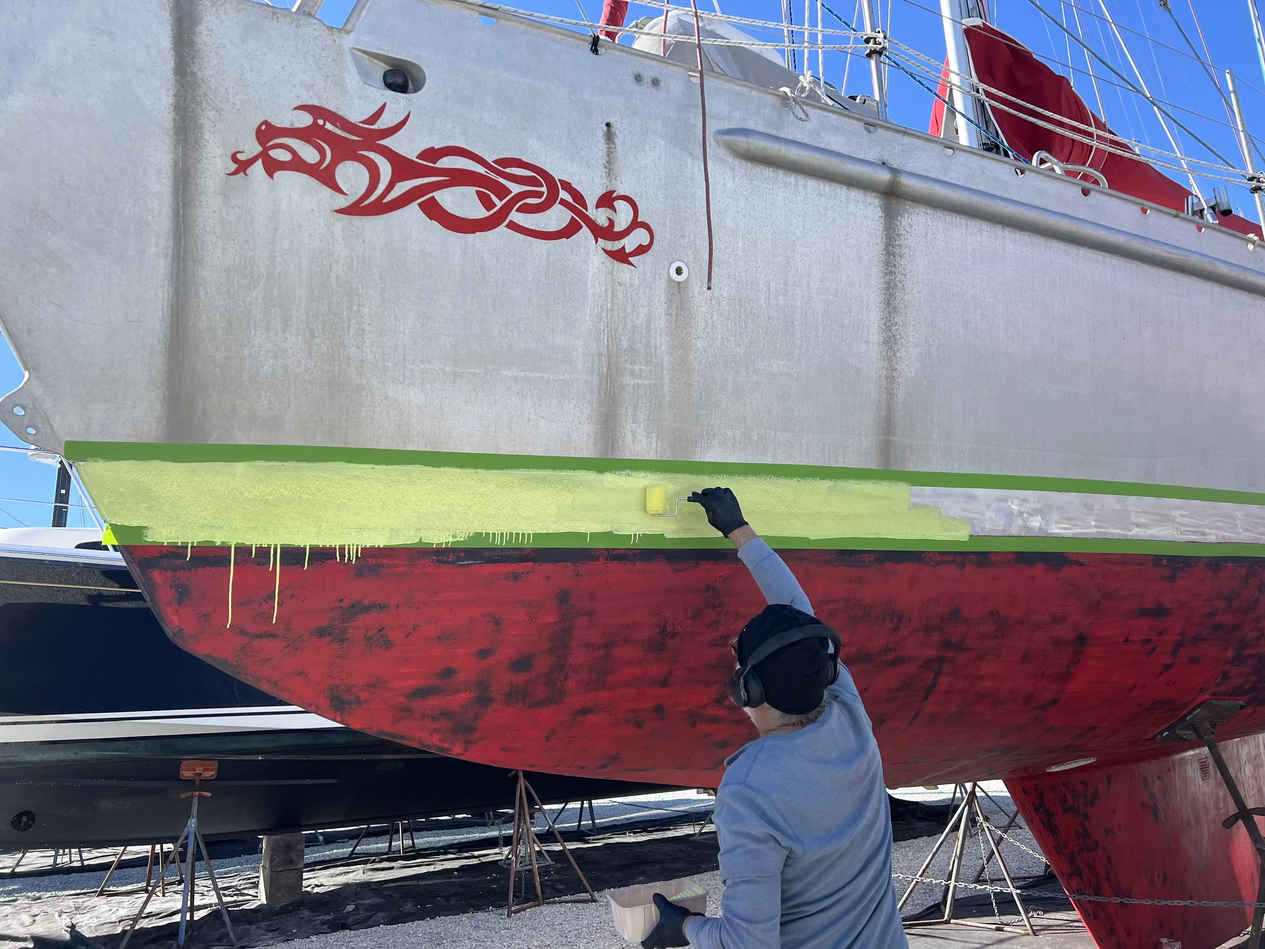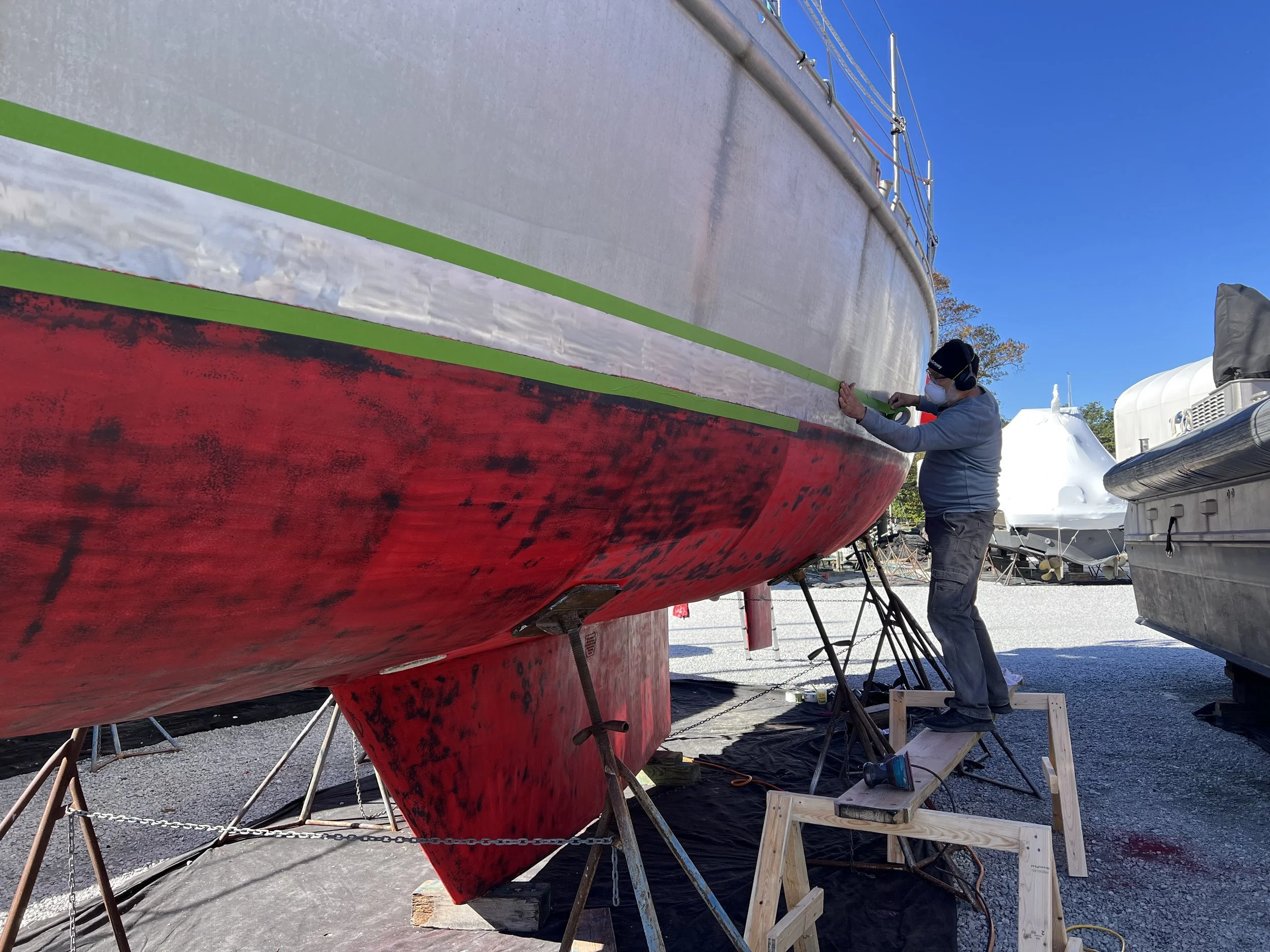 We hauled out and the next day a crew came to sand the bottom. Then began the process of repainting, including the priming and painting of a new boot stripe. The old vinyl stripe we had put on 2 years ago had not even survived the first passage down to the Carribbean. We had been shamefully sporting a tatty waterline stripe ever since, not having had the opportunity to fix it. Now it will be done properly. We also had to get a survey performed for the insurance underwriters, this went well with no issues and our theoretical value actually increased. Unheard of in maritime circles.