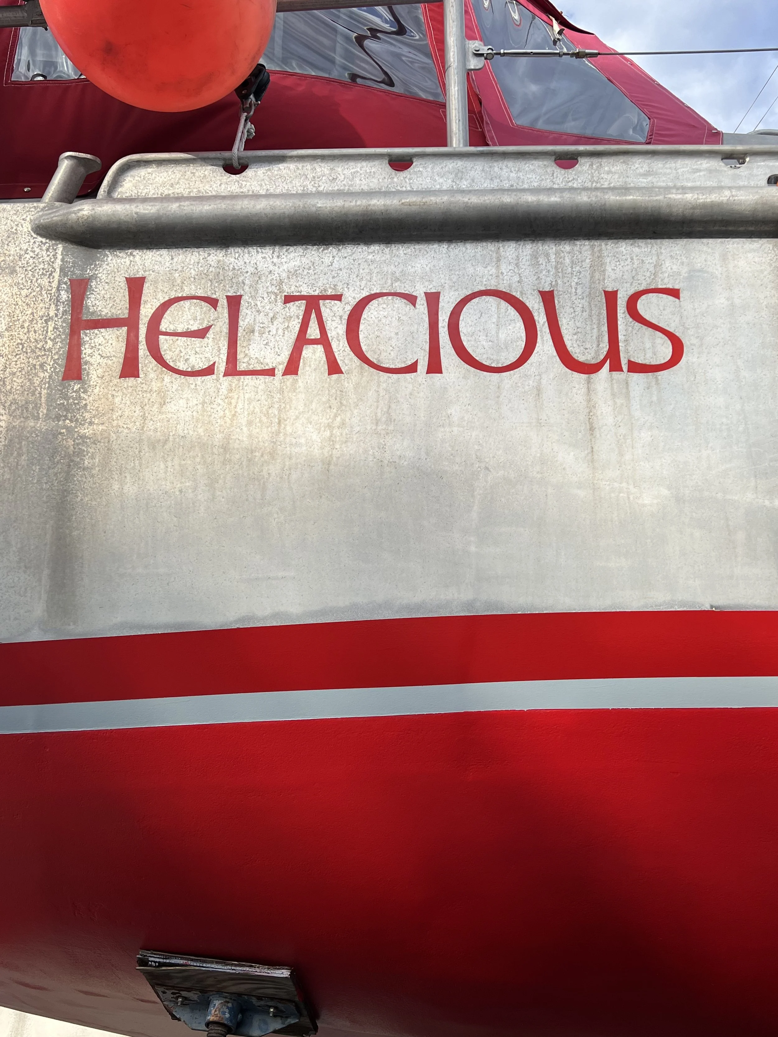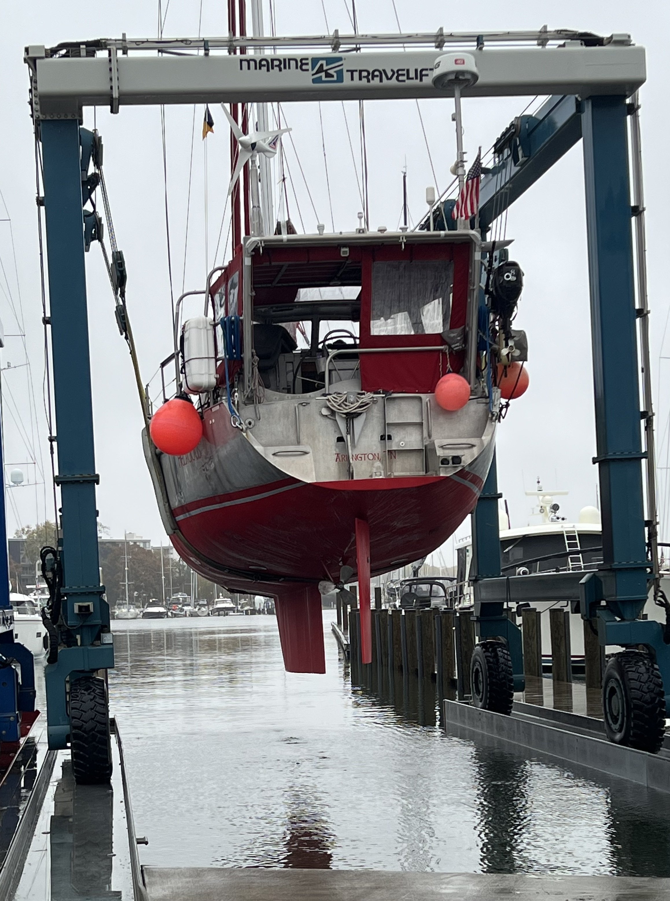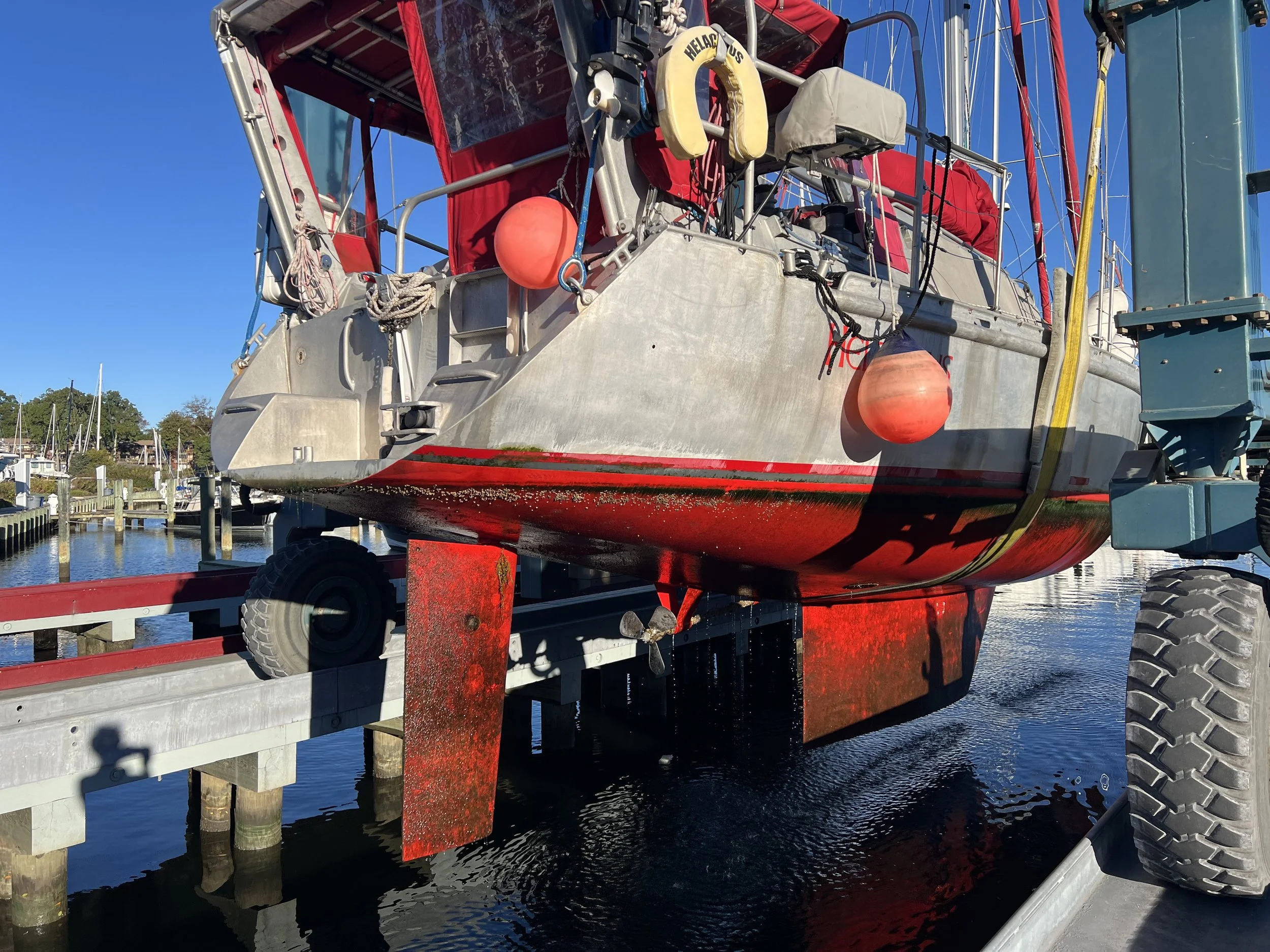 After a spell in Charleston visiting a birthday boy, and allowing the paint to dry, we return to Annapolis and the next day Helacious is back in the slings and hovering over the water.