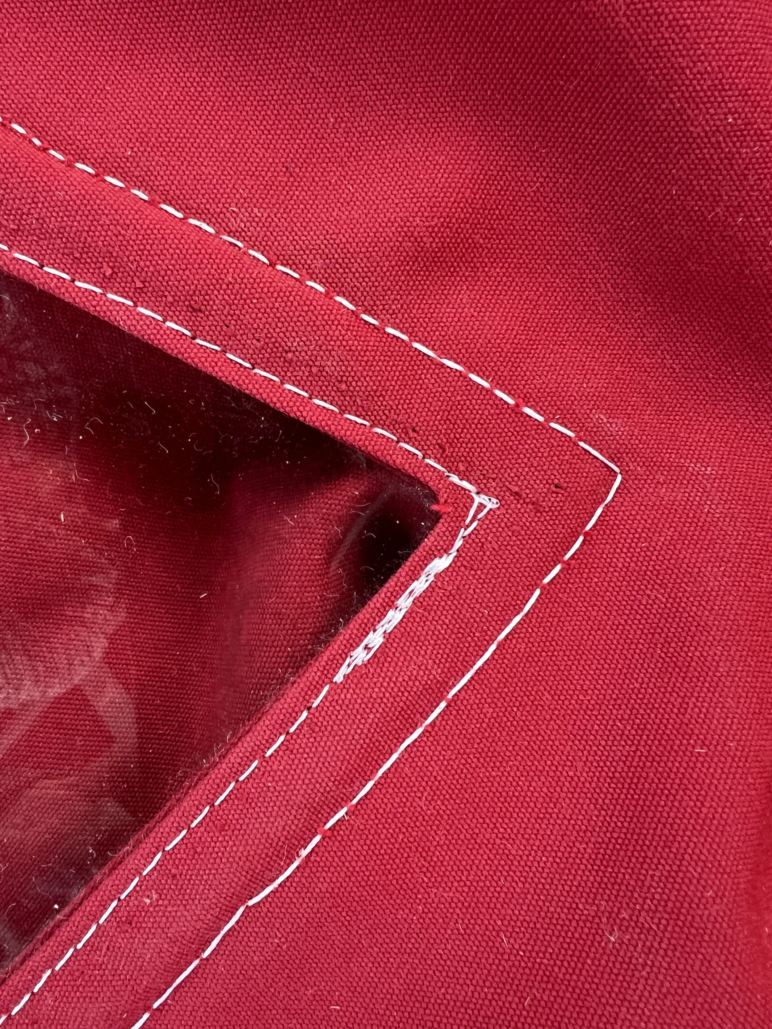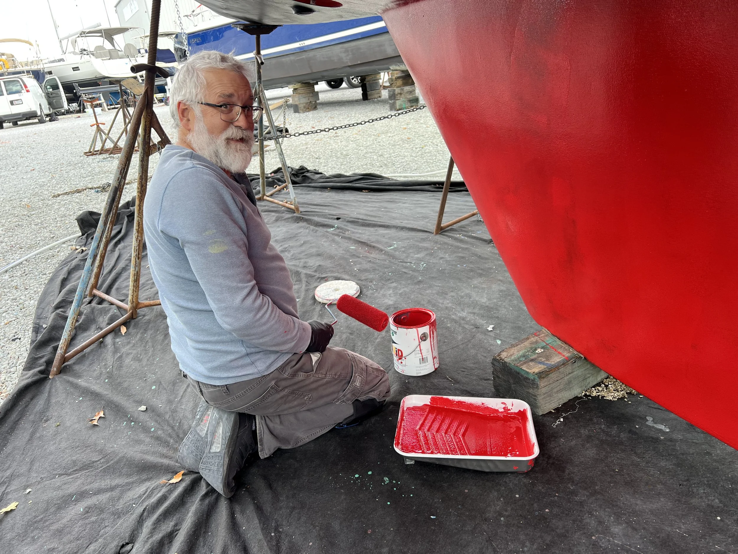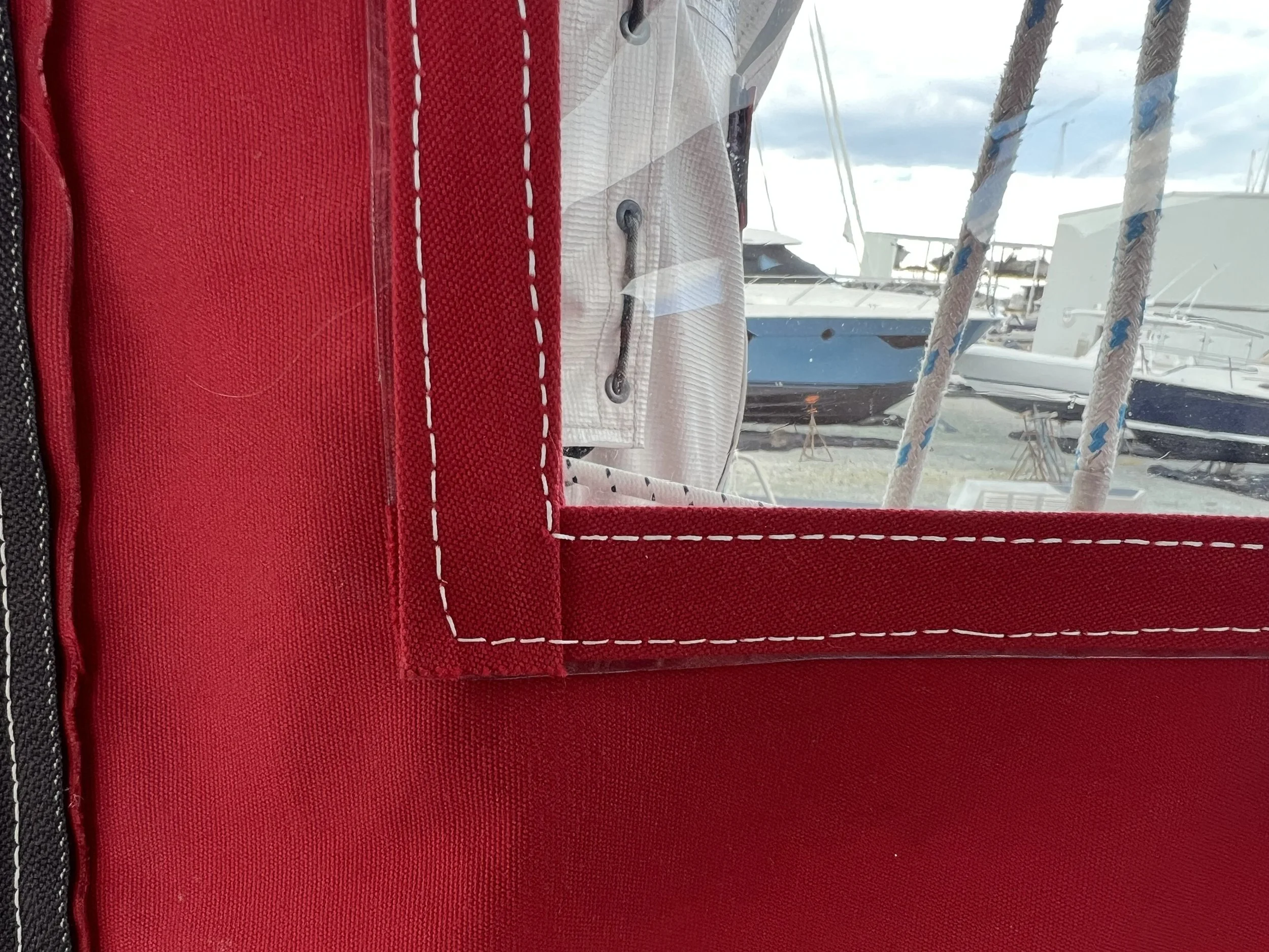 We made some saw horses so we could reach for painting the stripe, and used our fender board to walk along. The multiple layers of primer, epoxy and final coats meant there were 8 layers in all. We were so lucky with the weather, warm and dry for a whole week. There was also some sewing going on inside. We replaced all the clear vinyl material in the cockpit enclosure. Much brighter and no scratches.