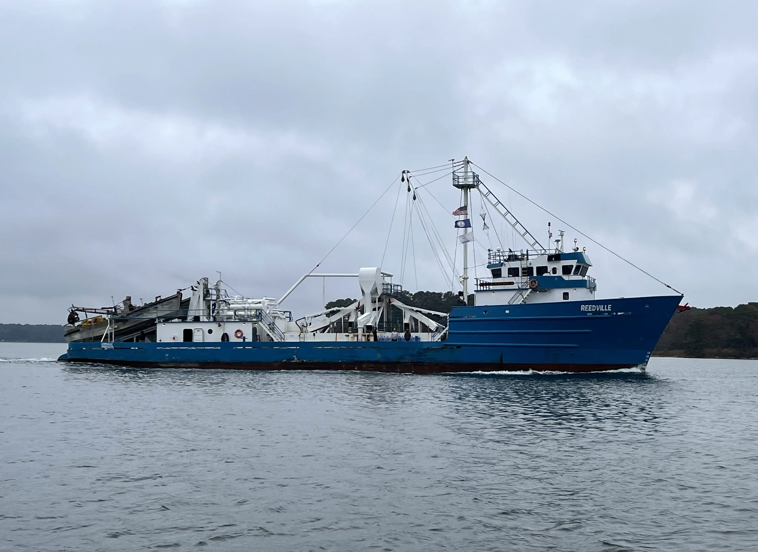 One morning, as we were at anchor eating breakfast this parade of more than ten specialized large fishing vessels came home after a night fishing. They are part of the last remaining fleet of Menhaden fishing boats. Menhaden is a small bait fish, however in this case it is processed into “protein”, to be used in fish and animal meal, in addition to fish oil. Some of the boats had a couple of powerful skiffs on the back, which could be launched with a net between which they would round up the Menhaden to then be hauled up into the larger ships for processing. Apparently Reedville, the base for this fleet, is known for its smelly fish processing plant. We were lucky, either they were not working or the wind was in the other direction.